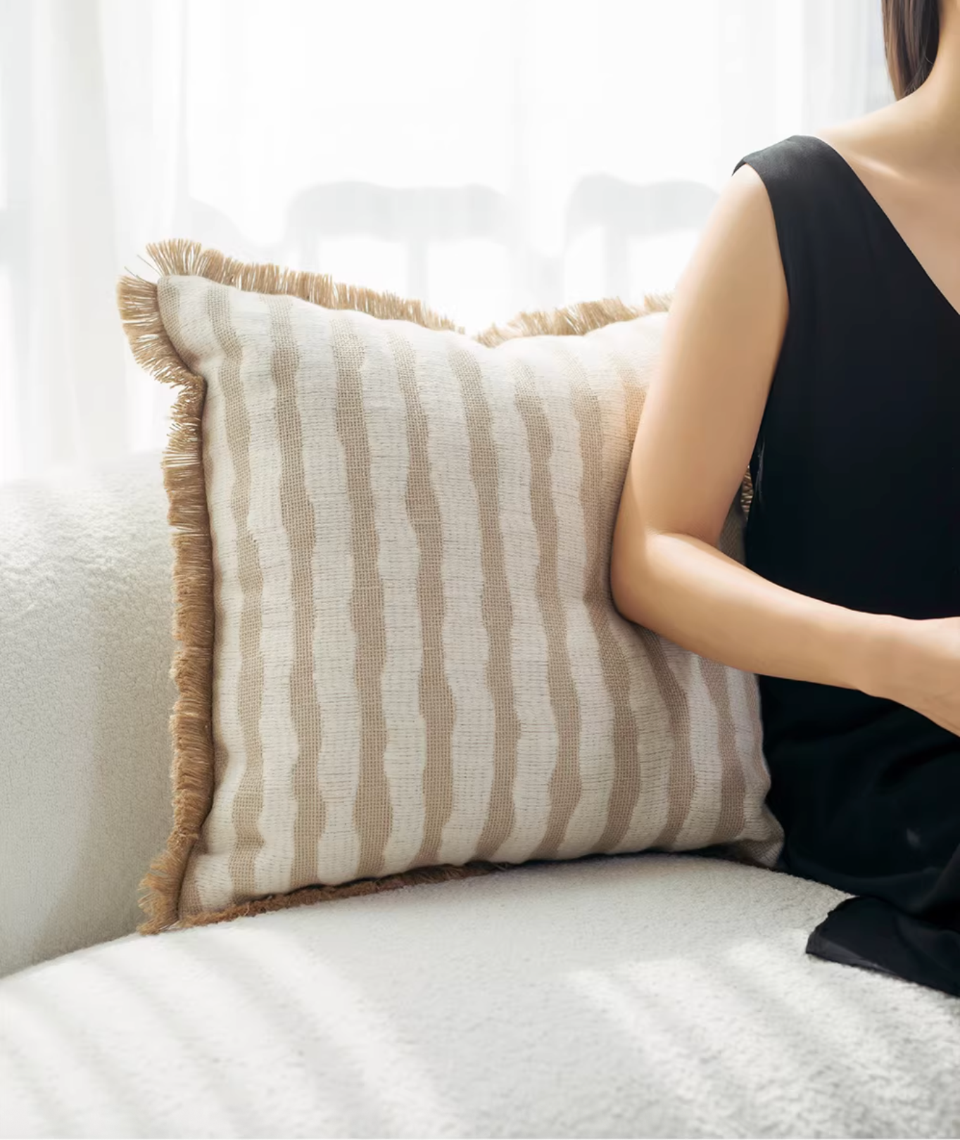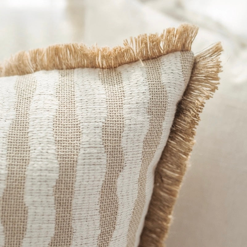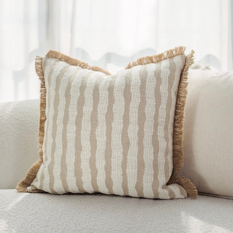Add effortless warmth to your space with this neutral striped cushion, featuring soft beige and ivory tones accented by a subtle fringed edge. Perfect for sofas or beds, it blends texture and comfort to complement both modern and coastal-inspired interiors.